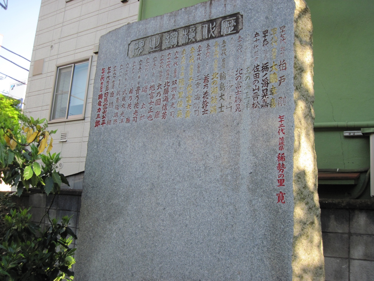 相撲の神様として祀られている野見宿祢神社の境内に建てられていました。かなり大きな石碑で、一番新しい名前が、第72代横綱稀勢の里でした。もちろん懐かしい大鵬、柏戸の名前もありました。まだまだ石碑に空白の場所が残されていて、次はだれの名前がきざまれるのでしょうか?