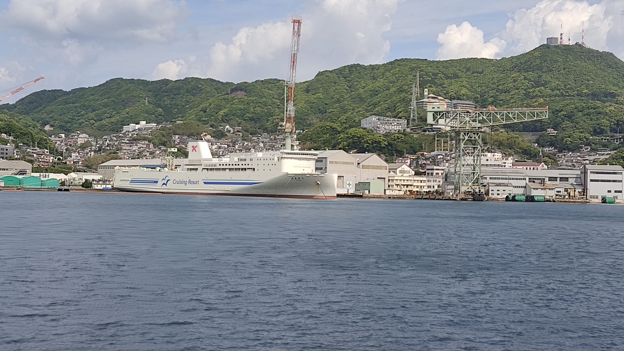 長崎港ターミナルを出るとまずは右手の造船所に日本海フェリーの新造船や海上自衛隊の新型護衛艦らしき船が繋留されていて興味津々で撮影。
