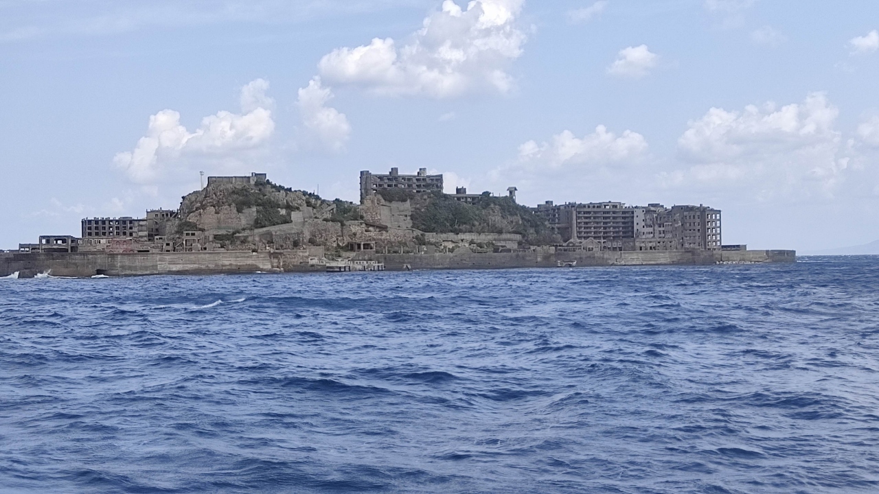 軍艦島は遠くからでもすぐそれと分かる異様な景色。小さな島に朽ちかけたビルがみっしりと並ぶ様子はSF映画が描くディストピアのようです。