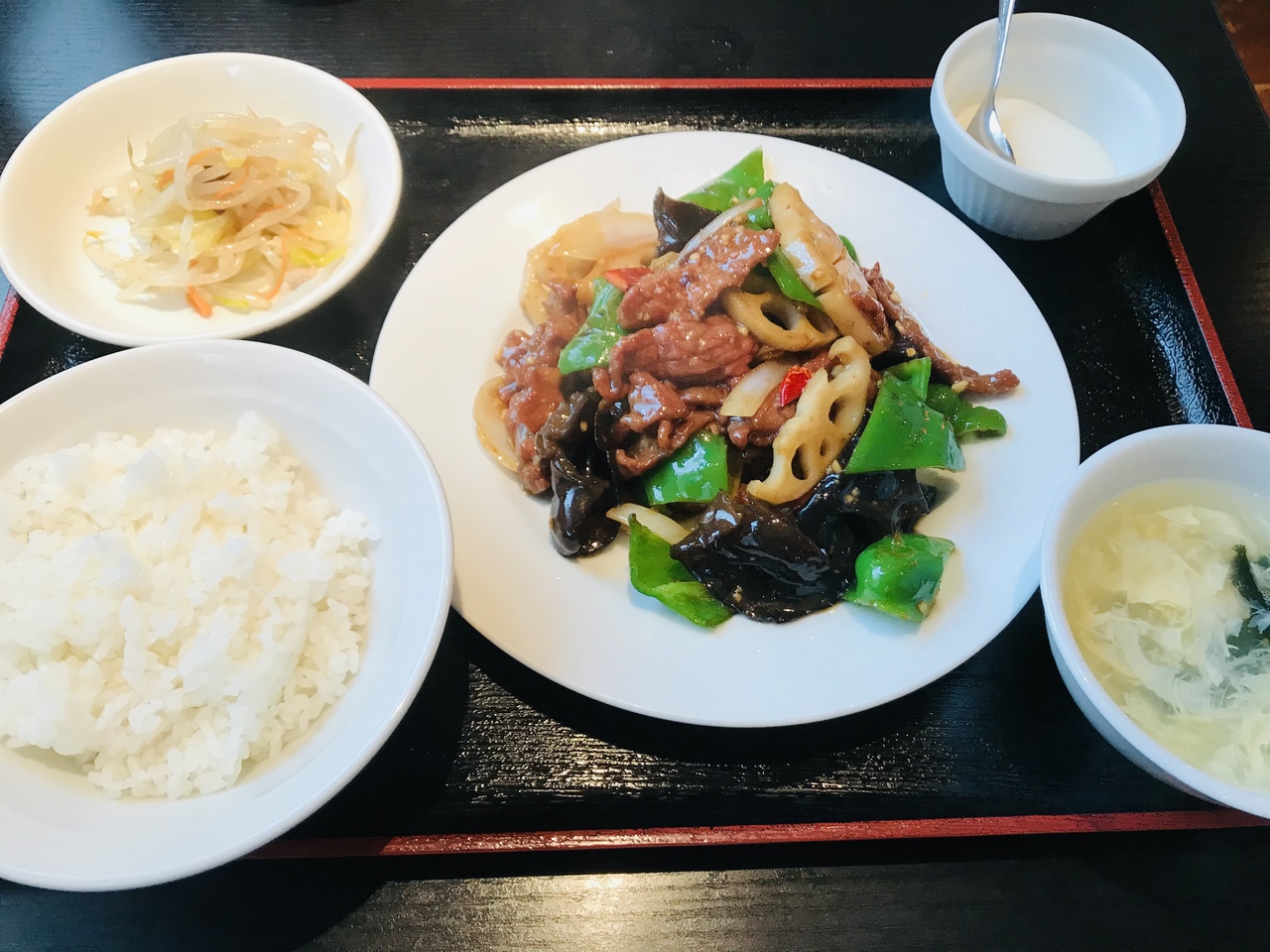 ランチタイムに、牛肉とれんこんとピーマンの炒め物定食をいただきました。