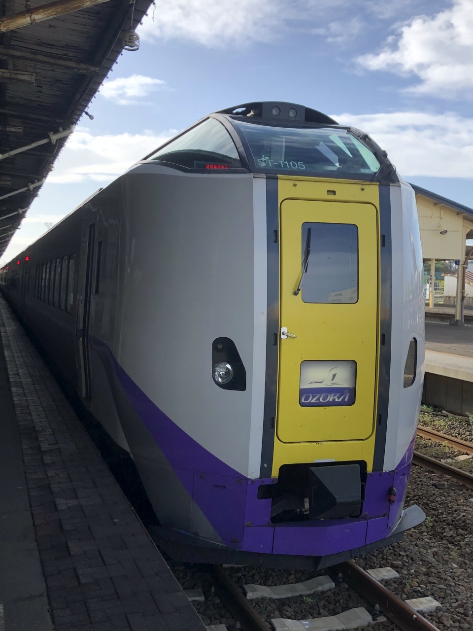 キハ283系というおおぞら専従の青の車両と、キハ261系という白と紫のどこでも走っている電車の2種類があり、既にキハ261系の方が乗れるチャンスが多くなっています。