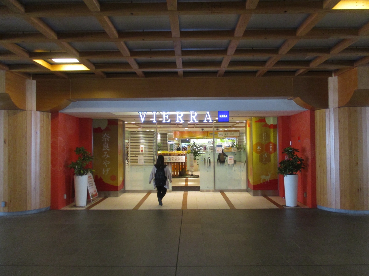 ビエラ奈良はJR奈良駅直結のショッピングモールです。改札口のある2階から入ると、飲食店、パン屋、和菓子屋、アイスクリーム店、カフェなどの食品店があり、奥へ行くと、リラクゼーション、100円ショップ、書店が並んでいました。専門店のほかに奈良名物のお土産物を扱う土産店があり、ちょっとした電車やバスの待ち時間に利用しました。