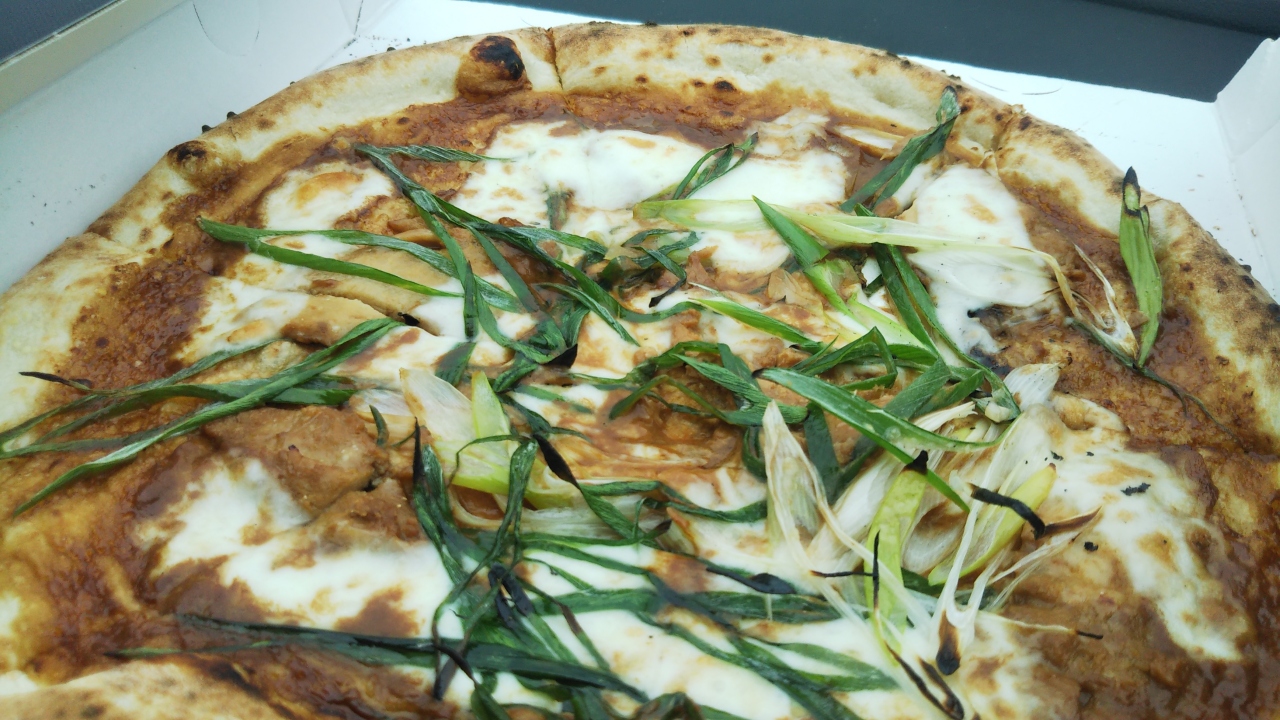 ここ限定メニュー「名古屋コーチンと八丁味噌のピッツァ」をオーダー。