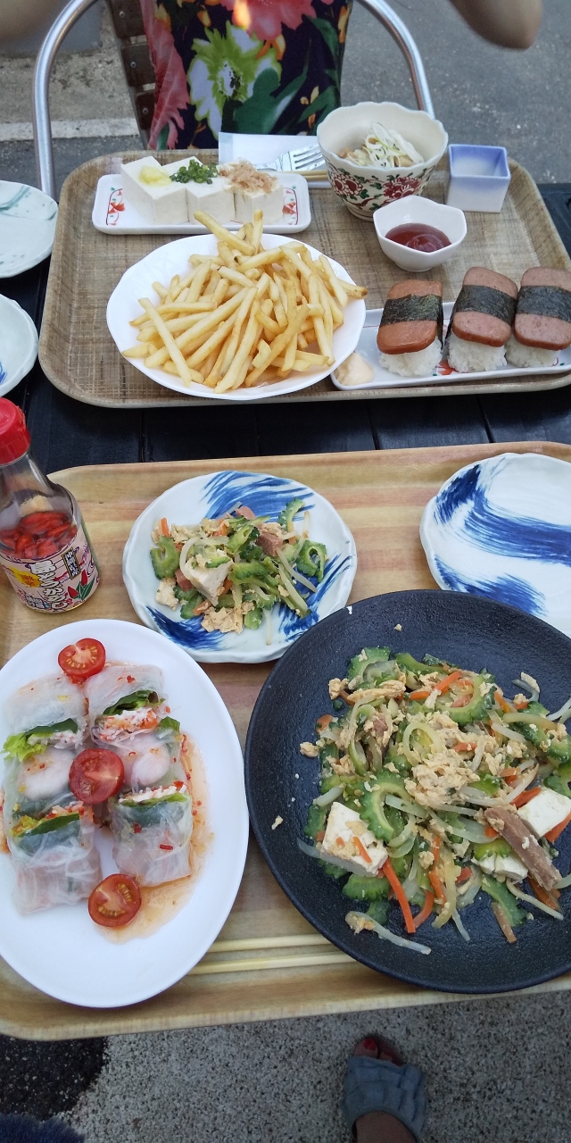 お料理が出来上がり次第呼ばれるのじゃなく、オーダーしたものすべてそろった状態で呼ばれます。19:30から無料の沖縄民謡ライブがありました。宮古島出身の女性でリクエストも受け付けてくれたし、とっても良かったです。席を立つ祭、マスクしてないと指摘されます。シギラの敷地内は無料でバスが出ていて、20分間隔です。屋台村向いのベイブリーズマリーナから乗ります。お酒はサワーで750円と観光地価格です。お料理はゴーヤーチャンプルーと生春巻きは美味しかったです。
