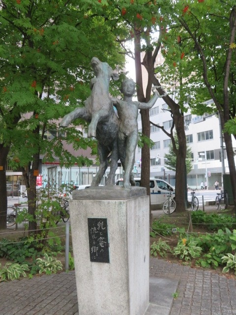 大通り公園の像は、ちゃんと名前が書いてあります。しかし、この像は、「牧童の像」ではなくて、「乳と蜜の流れる郷に」と書いてあります。何よりも牧童なのになぜ少年は裸なんだろうと考えてしまいました。遊び心がありますね。