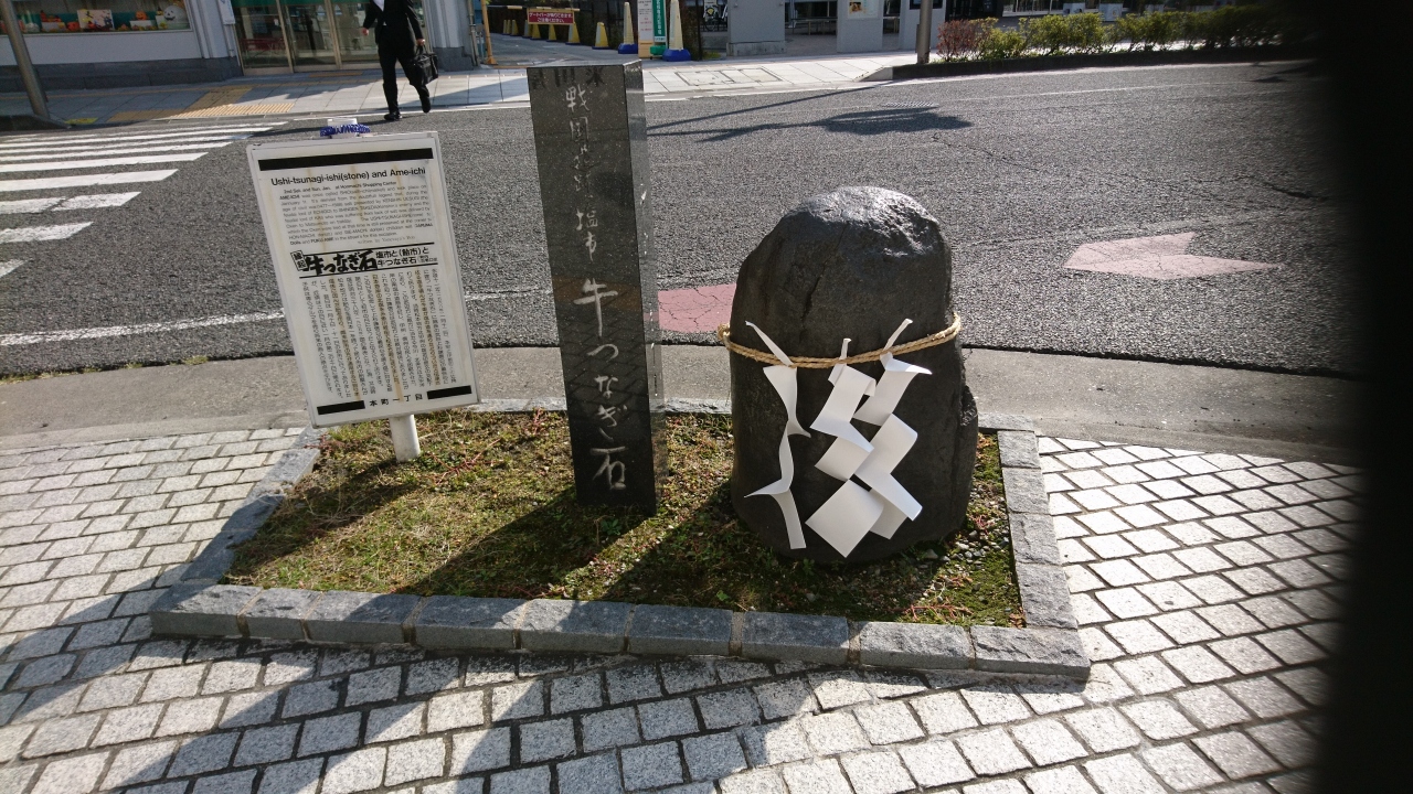 JR松本駅から松本城に向かう道路にある牛つなぎの石。これは牛をつないでいたものではありません。上杉謙信が武田信玄側に塩を送った「敵に塩を送る」にまつわる石だそうです。上杉謙信が送ったことで「塩市」が始まり、道祖神が塩を運んだ牛をつないだ石だと言われるようになったのがこの牛つなぎ石のいわれだそうです。歴史を学びながら、松本観光をしました。