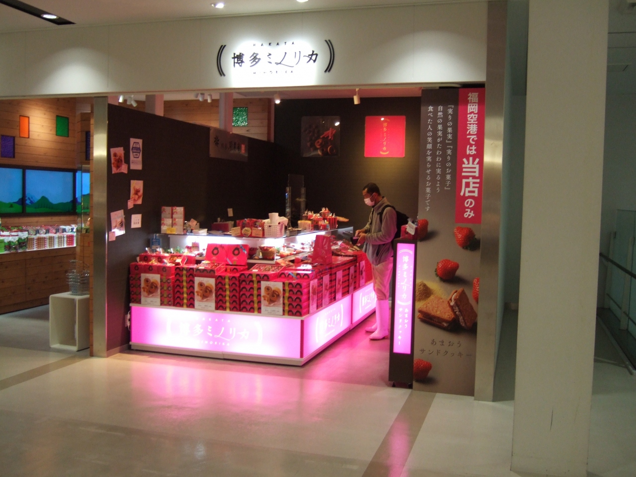 福岡空港の国内線ターミナルビル2階、ほぼ中央にあるお店。ピンクの照明でちょっと目立ちます。