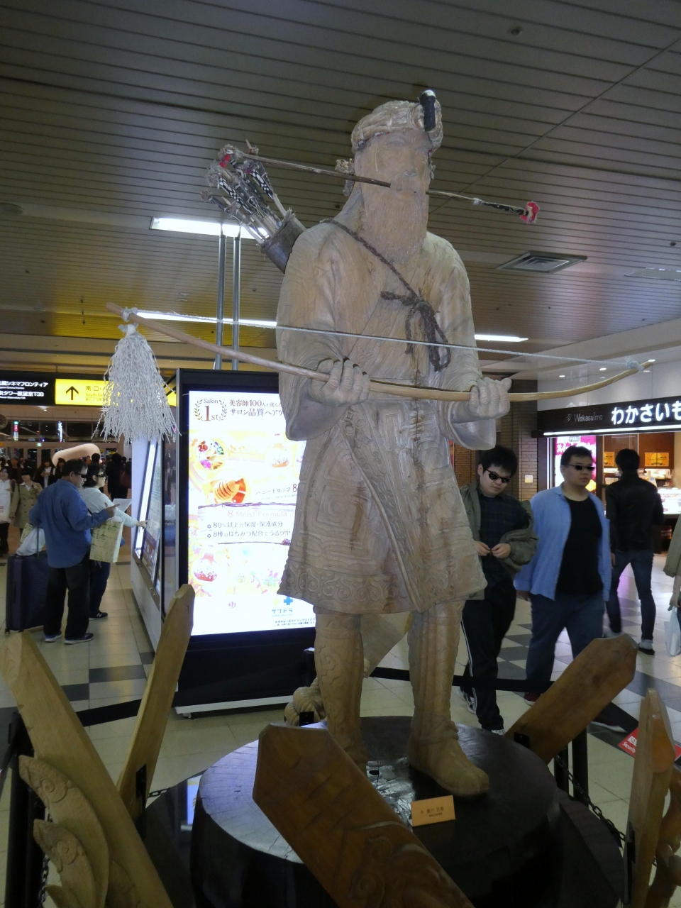 JR札幌駅の西口の改札口を出た所に直立不動で立っているアイヌの長老の木造です。