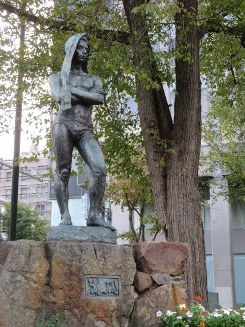 おそらく潮風と勘違いするかもしれませんが、湖風です。鍛え抜かれた身体をした青年の像です。札幌はなぜか裸像が多いのですが、こちらの像はちゃんとパンツをはいています。タオルをかぶせているのですが、髪型も見てみたいですね。