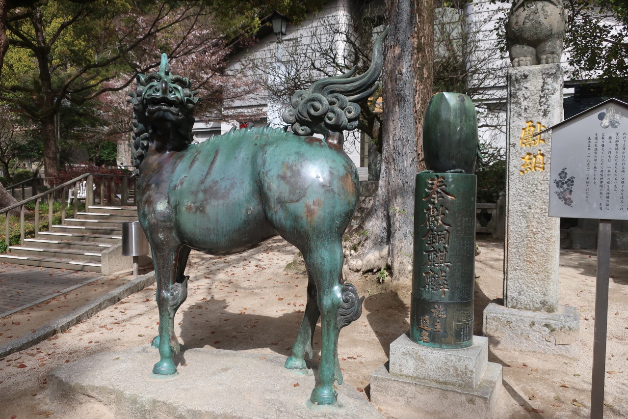 太宰府天満宮楓社を過ぎたところに建っているのが麒麟像。手水舎近くでもあります。麒麟は、空想上の聖獣で、徳をもって世を治める王者の象徴とされているそうです。道真公の生涯と重ね合わせられ、1852年に奉納されたようです。頭は狼というだけあって、凛々しく、迫力がありました。なかなか見応えがありますよ。隣には鶯像も建っていました。