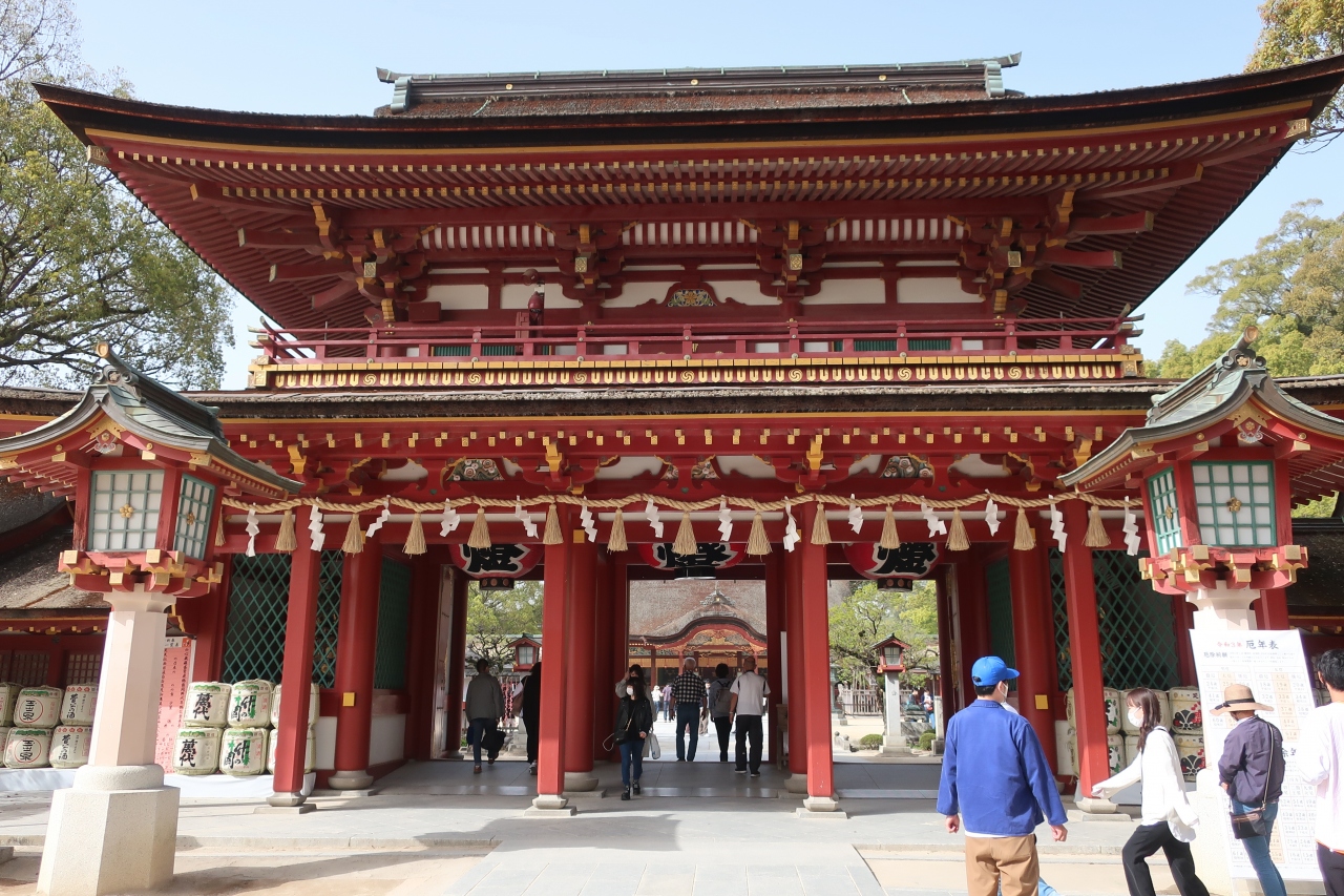太宰府天満宮御本殿へ通じる楼門。楼門とは2階建ての門のことで、太宰府天満宮の楼門は入母屋造の二重門です。二重門とは、上の層にも下の層にも屋根があることをいいます。こちらの門は、御本殿側と太鼓橋側で形状が異なる珍しい楼門だったようですが、気付かず太鼓橋側からのみ見学しました。知っていたら、御本殿側もしっかり見学できたのにー。朱色が映え、非常に立派な門でした。現在の門は1914年に再建されたものです。