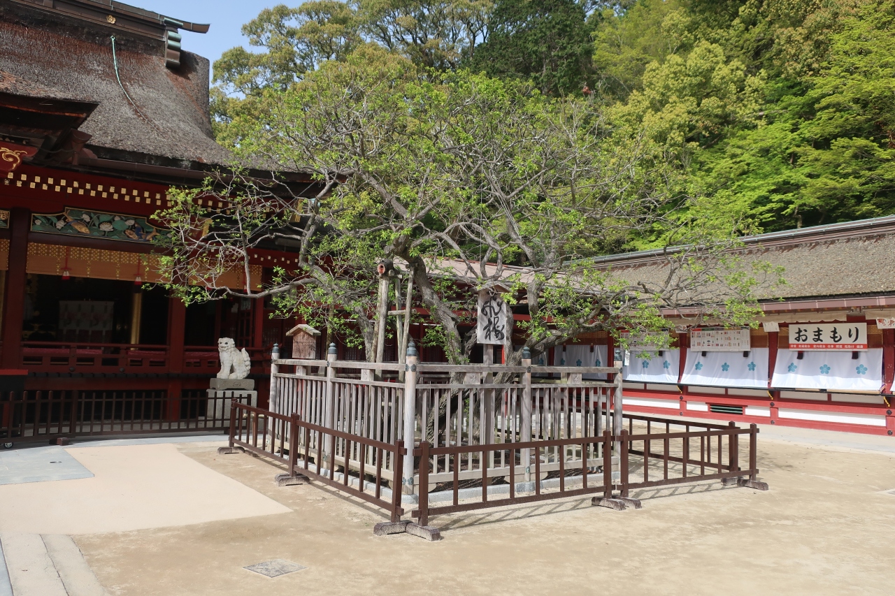 太宰府天満宮御本殿の右手前にあるのが飛梅。道真公を慕って、都から一夜にして飛んできたと伝えられる由縁の御神木です。2月には素晴らしい花を咲かせるようですが、訪れた時期は3月下旬。しかし、見事な梅の木を見ることはできました。