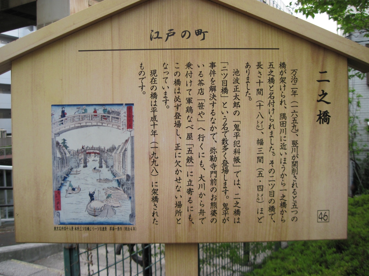 立川に架けられている橋で、隅田川から数えて2番目の端なので、単純に二之橋と呼んでいたらしいです。今でも昔のまま、その名称が付けられていました。橋の脇には葛飾北斎の富岳三十六景、深川立川の画が、案内板に書かれていて、江戸時代のこの辺りを感じさせてもらいました。