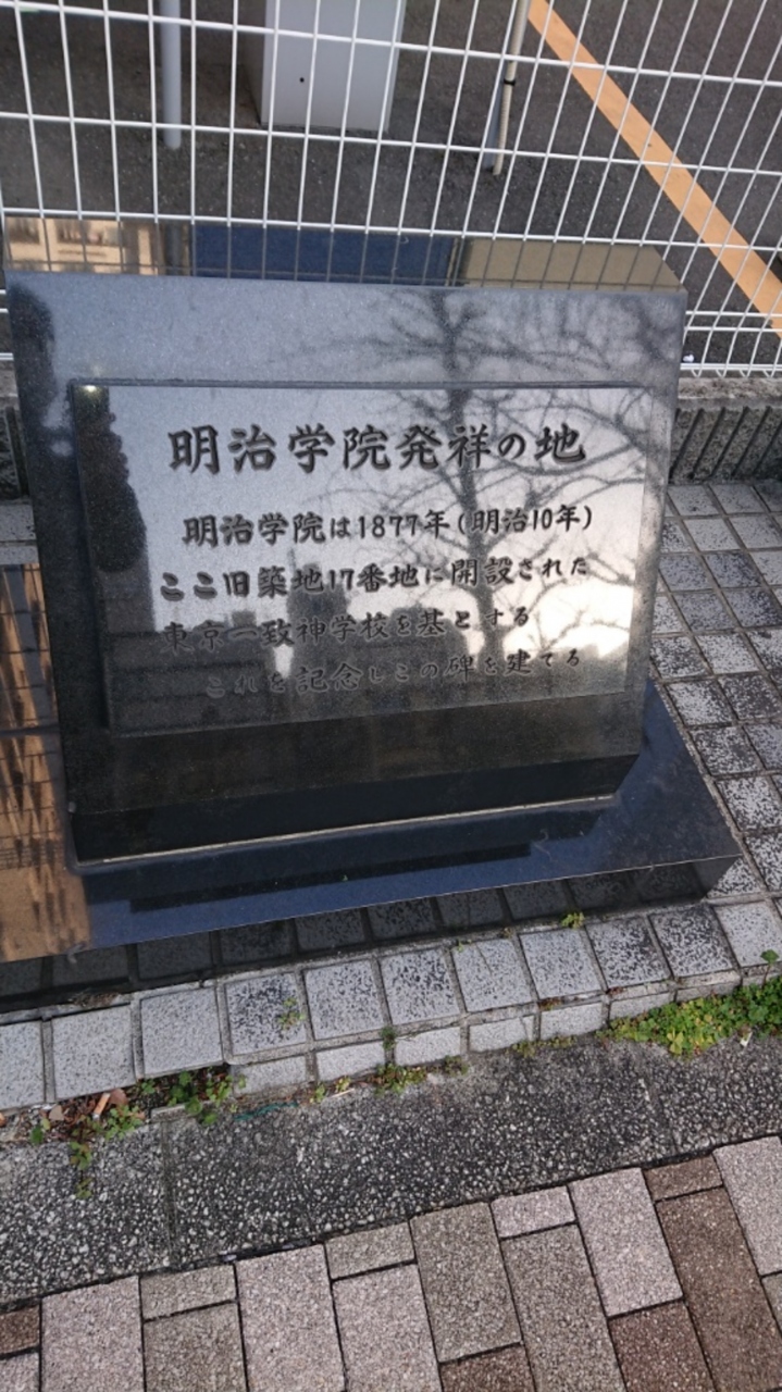 築地駅から歩いて数分のところにあります。黒い記念碑です。明治学院がここからはじまり、大きく発展していった歴史があります。創立100年を記念して作られた記念碑になります。この付近は、色んな学校の発注記念碑