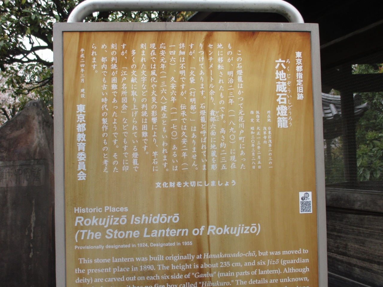 浅草寺 影向堂の近くの小さなお堂などが集まる場所にあります。六角形のお堂に覆われた石灯籠です。お堂は見るからに古いです。相当な歴史がありそうです。説明板も古そうでした。石灯籠の六面にお地蔵様が刻まれています。見辛いのが少し残念でした。