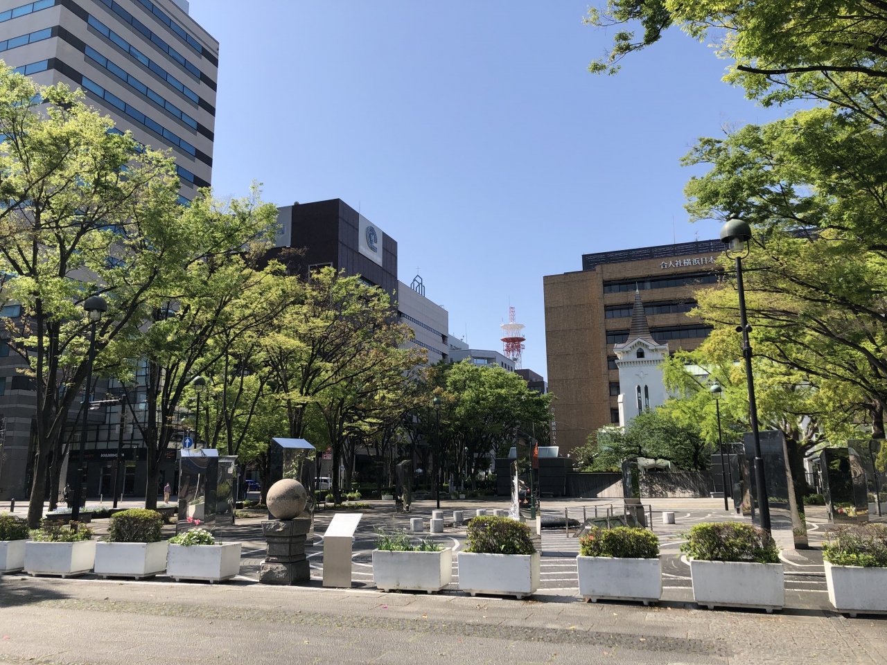大さん橋通りと海岸通り(国道133号線)の2つの通りに面して、開港広場公園があります。横浜のこの地で、1854年に日米和親条約が締結されたということで、公園内に記念碑が立っています。この条約の5年後、1859年に横浜港が開港されました。