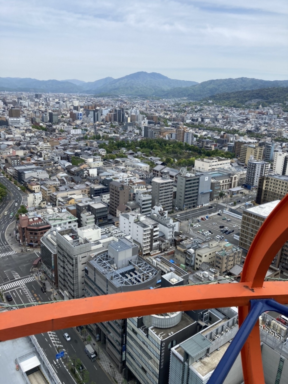 京都には高い建物がないので、見晴らしは期待以上です。実際より高いところに上がってみたよう。遠くは山の稜線までくっきり見えました。