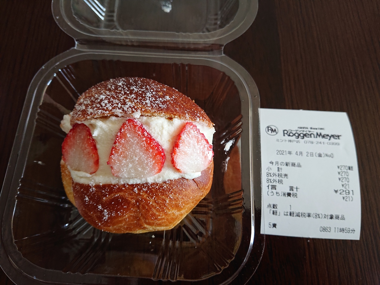 三宮駅前のミント神戸の地下を歩いていたところ、ローゲンマイヤーの看板にマリトッツオの文字を発見しました。最近流行りのイタリアのデザートパンです。冷蔵庫に一つ291円で並んでいました。イチゴが3切れ乗っていて見た目がキュートです。美味しかったのですが、もう少しパンがフワッとしていた方が良かったかもしれません。