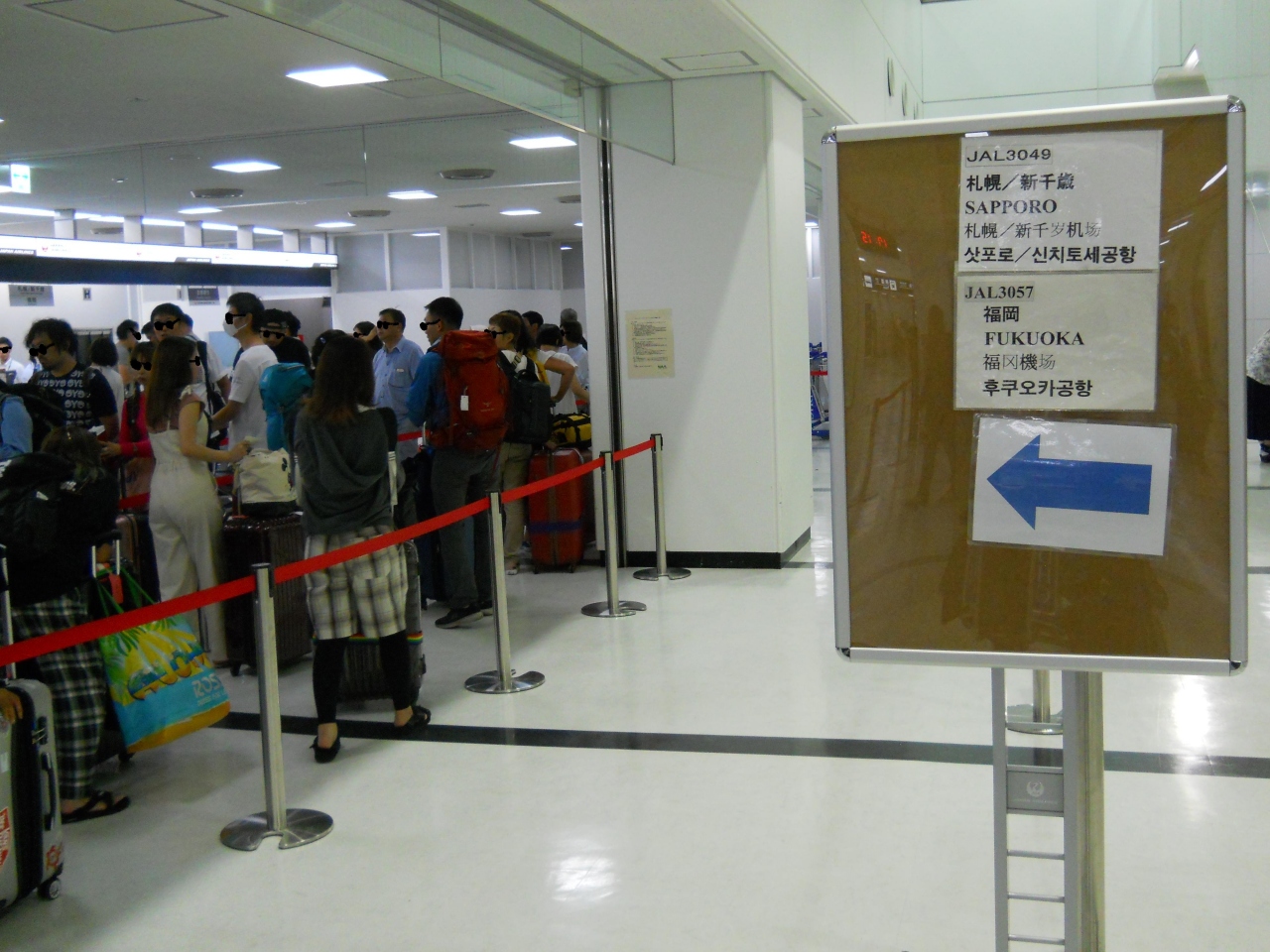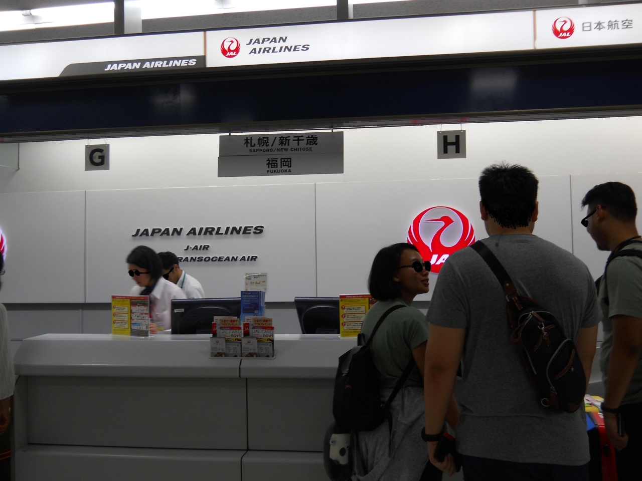 第2ターミナル1階国際線到着ロビー奥にJAL国内線カウンターが有りますがJAL自社便運行の新千歳と福岡行きは搭乗手続きの列が別でそれ以外の他社便運行のJALコードシェア便は凄いことになってて訪日客が怒ってました。