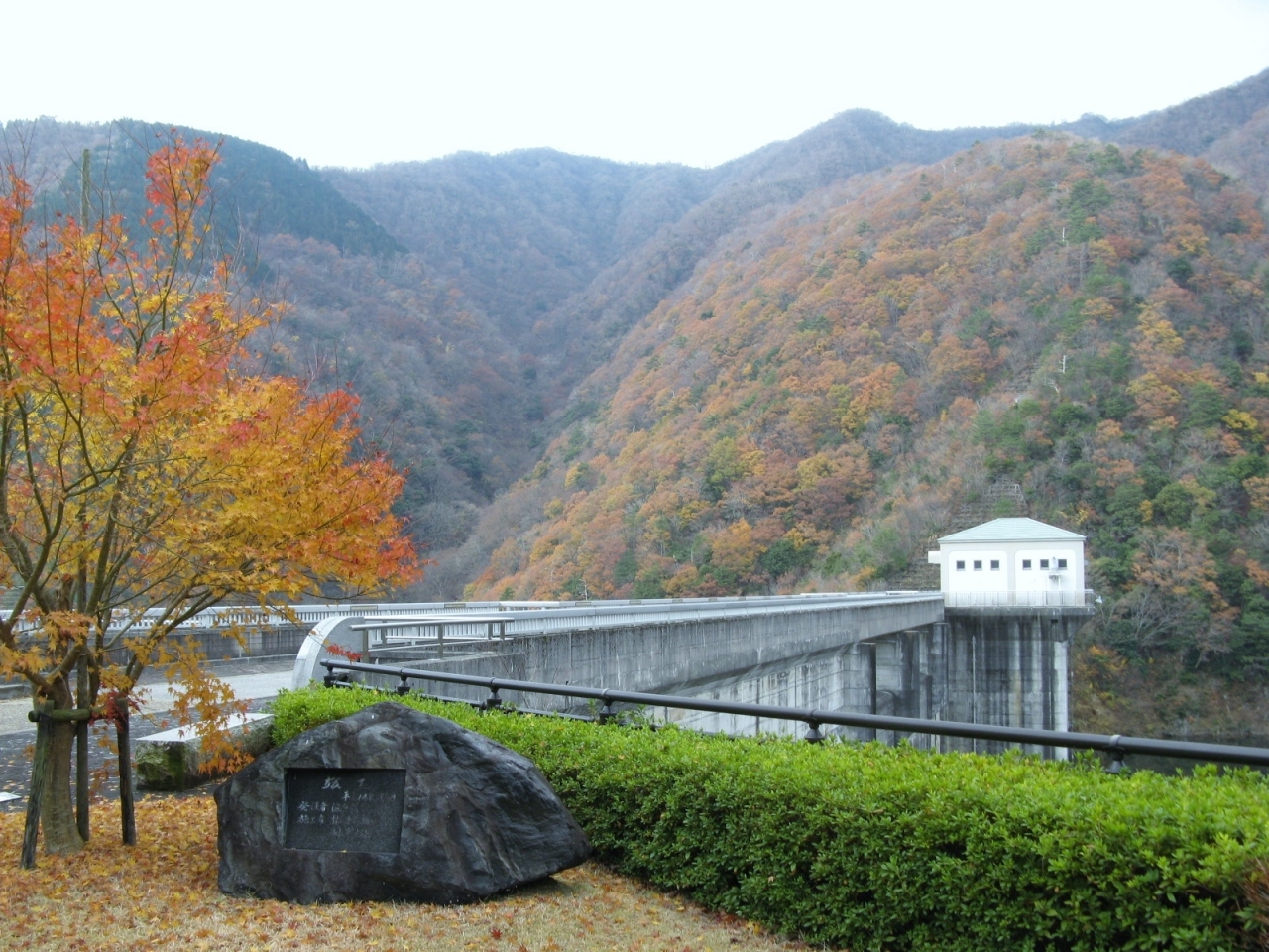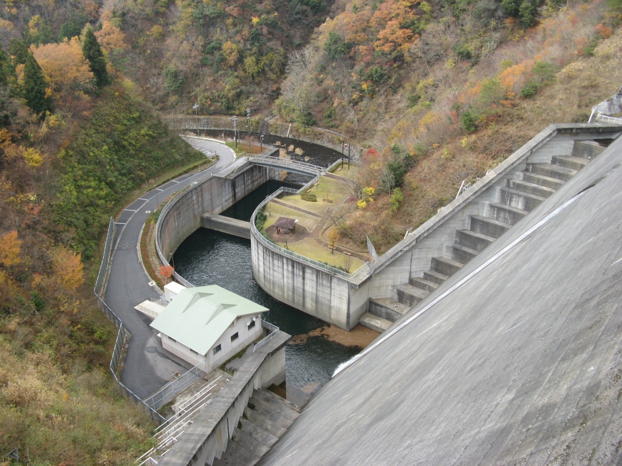 ダム堤体上は通行が可能で、堤体上から下流側を覗くと迫力があり、ダム下には東屋を備えた広場も見えましたので、ダム下にも行ってみて下からもダムを眺めることができました。ダムを渡りきった所にもベンチを備えた休息スペースがあるのでそこからダムを眺めるのも良いと思います。