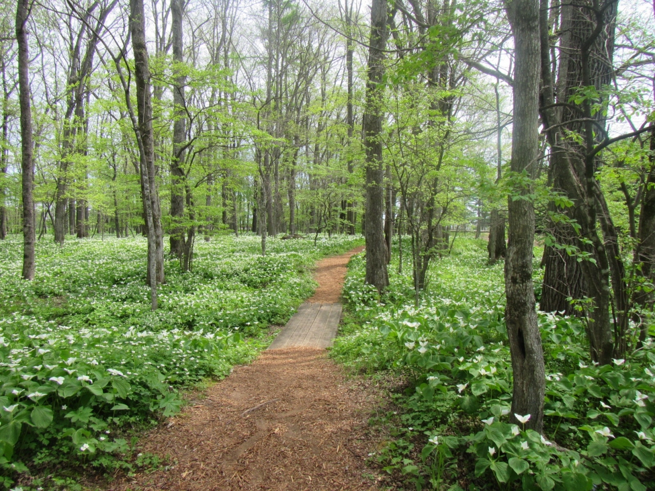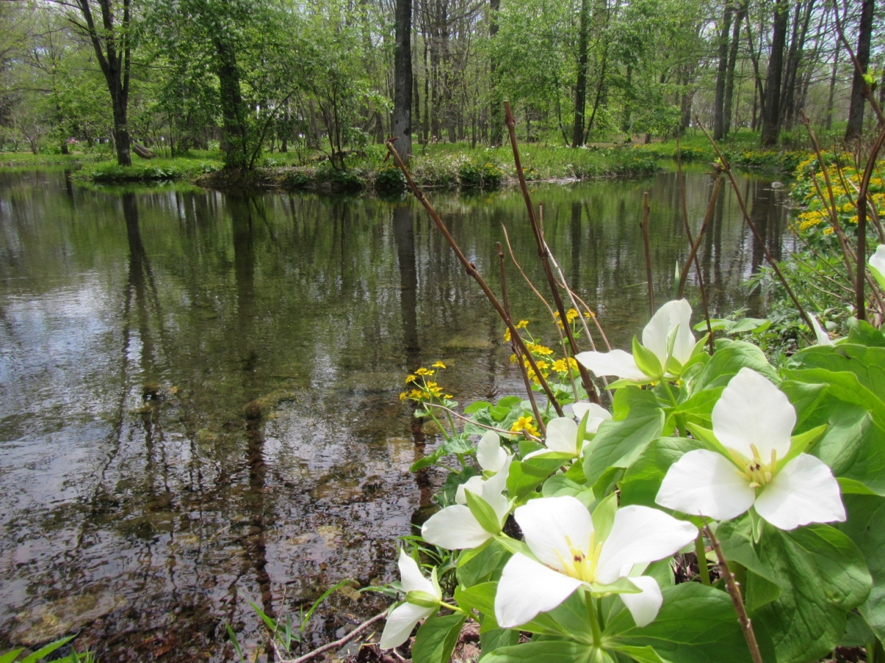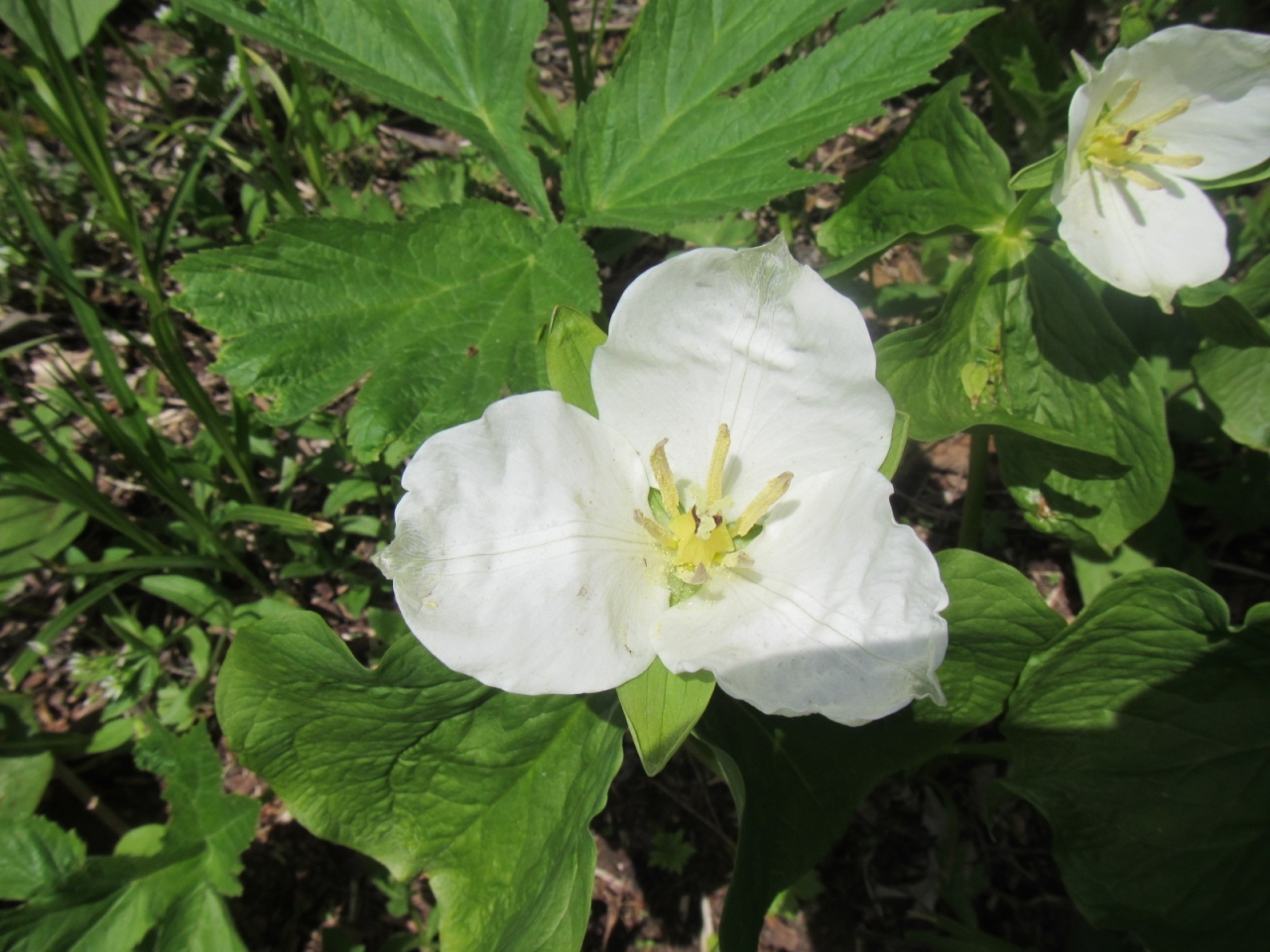 一方、カタクリは咲き終わりの時期で、実をつけているものもありましたが、一部、エンレイソウの合間にまだ花を残しているものを見つけることができました。花の量的にオオバナノエンレイソウが一番多く、花の大きいシラネアオイと同時期に咲く上に、エゾノリュウキンカもまだ見られるため、オオバナノエンレイソウが見頃の時期に訪れるのが一番良いように思います。その年の気候にもよりますが、5月中旬半ばから後半にかけてがクライマックスのようです。勿論、小川の畔に咲くミズバショウやハマナスの一群が咲く時期も捨てがたく、可能なら年間パスポートを購入して複数の時期に訪れたいところです。