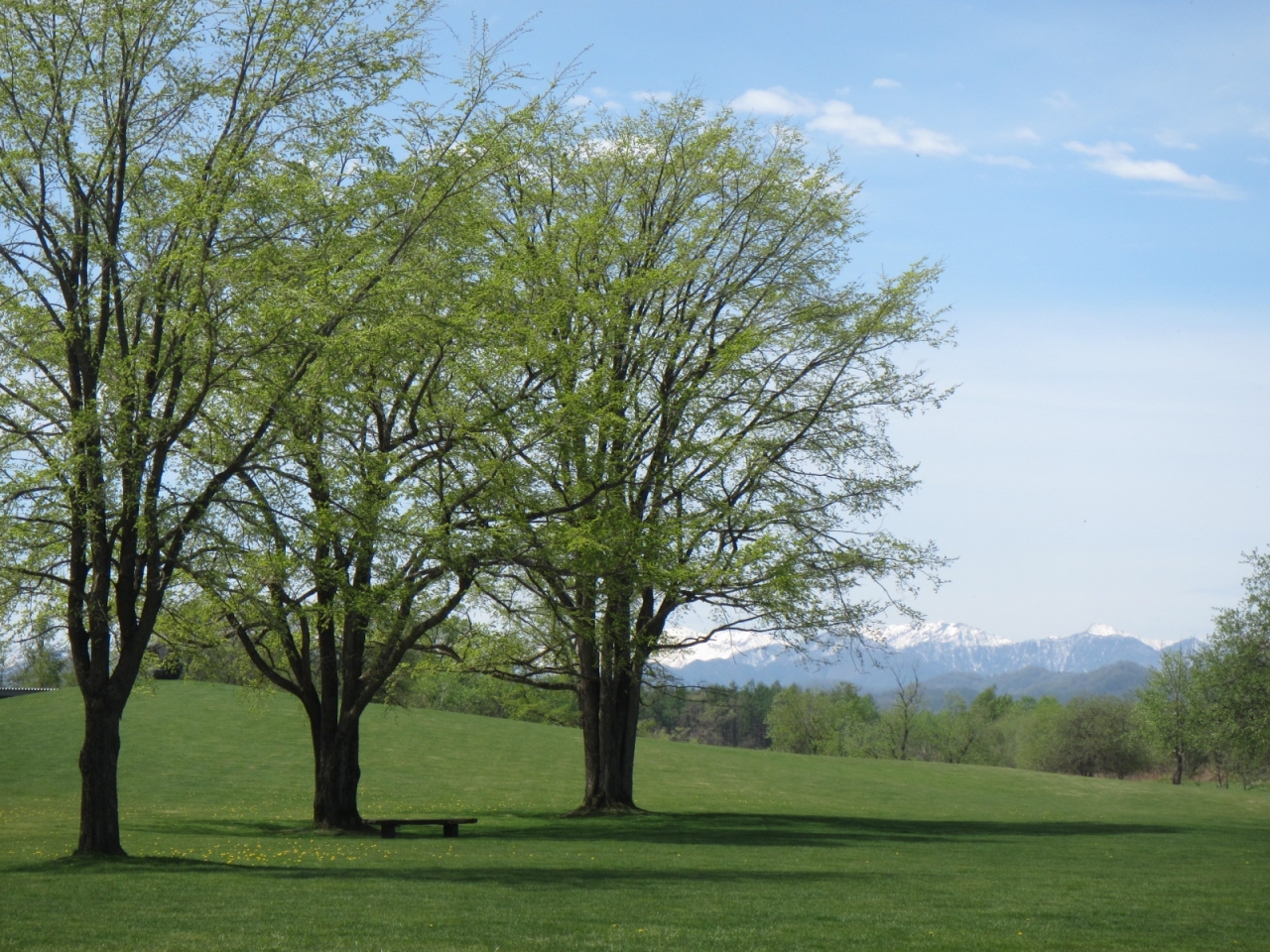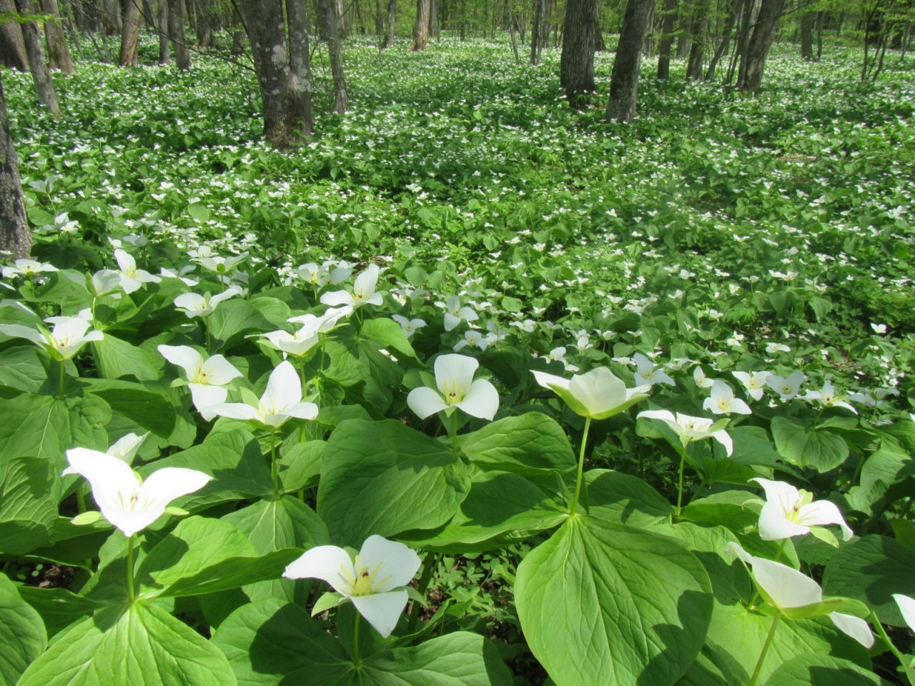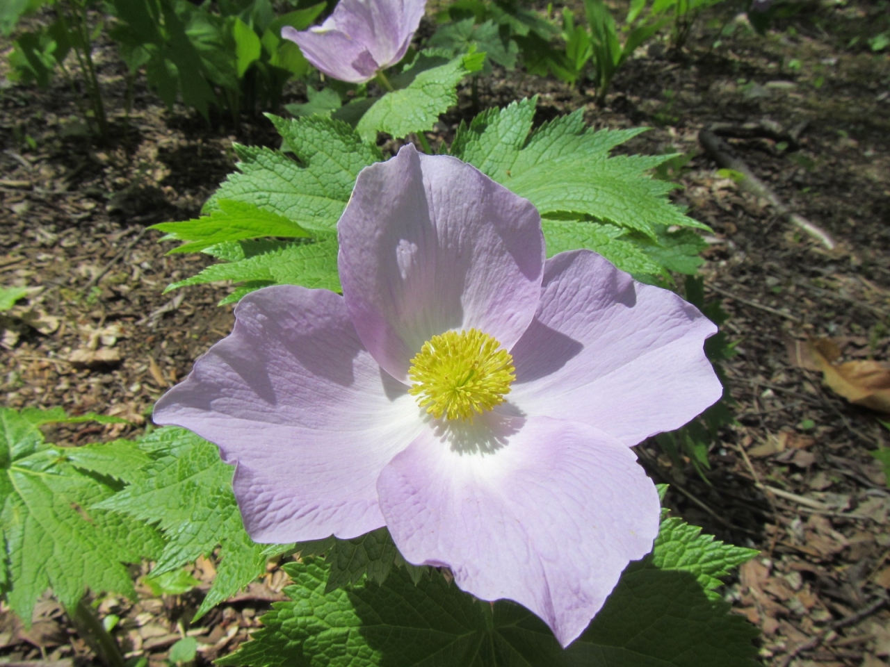 5月中旬、オオバナノエンレイソウが一面に咲き乱れます。同じくしてシラネアオイも見頃となり、エゾノリュウキンカもまだきれいに咲いていました。新緑の樹林下に流れる小川に、黄色いエゾノリュウキンカが咲く様子は清々しいメルヘンの森に迷い込んだようです。