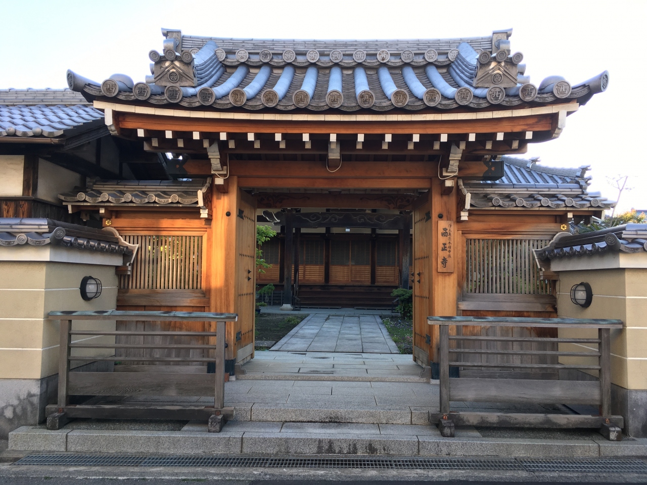 JR塚口駅から南東に徒歩で10分弱のところ、上坂部という地域にある浄土真宗本願寺派のお寺です。周囲は住宅街に囲まれていて、町のお寺といった感じです。お寺の門構えが立派で、扉が開いていたので少し中に入らせてもらいました。境内は思った以上に広く、庭にはお花が咲いていて綺麗に手入れされていました。講演会やお祭りなど、地域に密着した活動もされているようです。