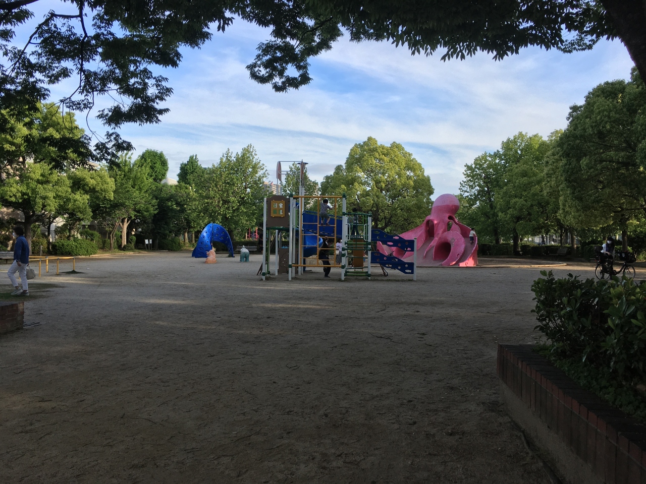 JR尼崎駅から北へ10分程歩いたところにあります。すぐ近くに小学校もある住宅地の中で、広いグラウンドが併設されていてます。公園内は広くて遊具も色々設置されていますが、大きなタコのすべり台があるのが特徴的です。子供たちが多く遊んでいて、ベンチで休憩する人など、地元の方々にとって憩いの場のようでした。