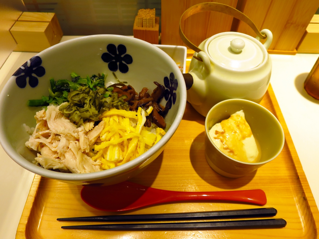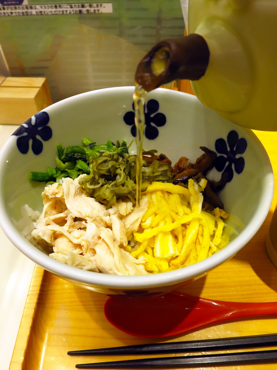 鶏肉や刺身、野菜など、様々な具材が取り揃えられています。『お茶漬け』というように、給仕される出汁を丼にかけるのが一般的ですが、出汁をかけなくても、またはほんの少量だけでも美味しくいただけます。具材も出汁も総じて味は薄目ですが、後味を引くような濃さはありません。