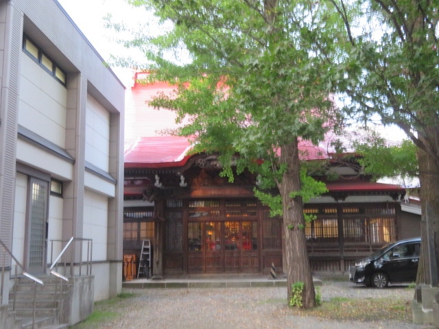 二条市場から程なく行った場所にあります。何といっても大きな赤い屋根が北海道の9月の空に映えていました。こちらのお寺は、赤がシンボルカラーのようで、鐘も赤い東屋のような建物に吊るされていて、斬新!と思いました。