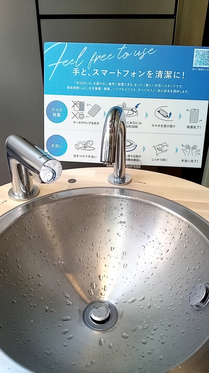 銀座にある「伊東屋 銀座本店」の店頭に「WOSH」が設置されていました。水道のない場所に設置することが出来る最新の手洗いスタンドです。スマートフォンまで除菌することが出来ることでも話題となっています。