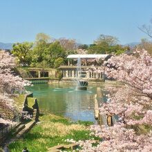 琵琶湖の水を京都へ送るため、明治時代に造られた水路です。平安神宮や京都市京セラ美術館などがある岡崎近辺の疏水は、桜の名所としても知られています。以前、十石舟めぐりで舟から岡崎疏水沿いに咲く桜を眺めました。橋の上から琵琶湖疏水の噴水が吹き上がり、周囲の桜も見事です。また、近くには琵琶湖疏水記念館もあります。