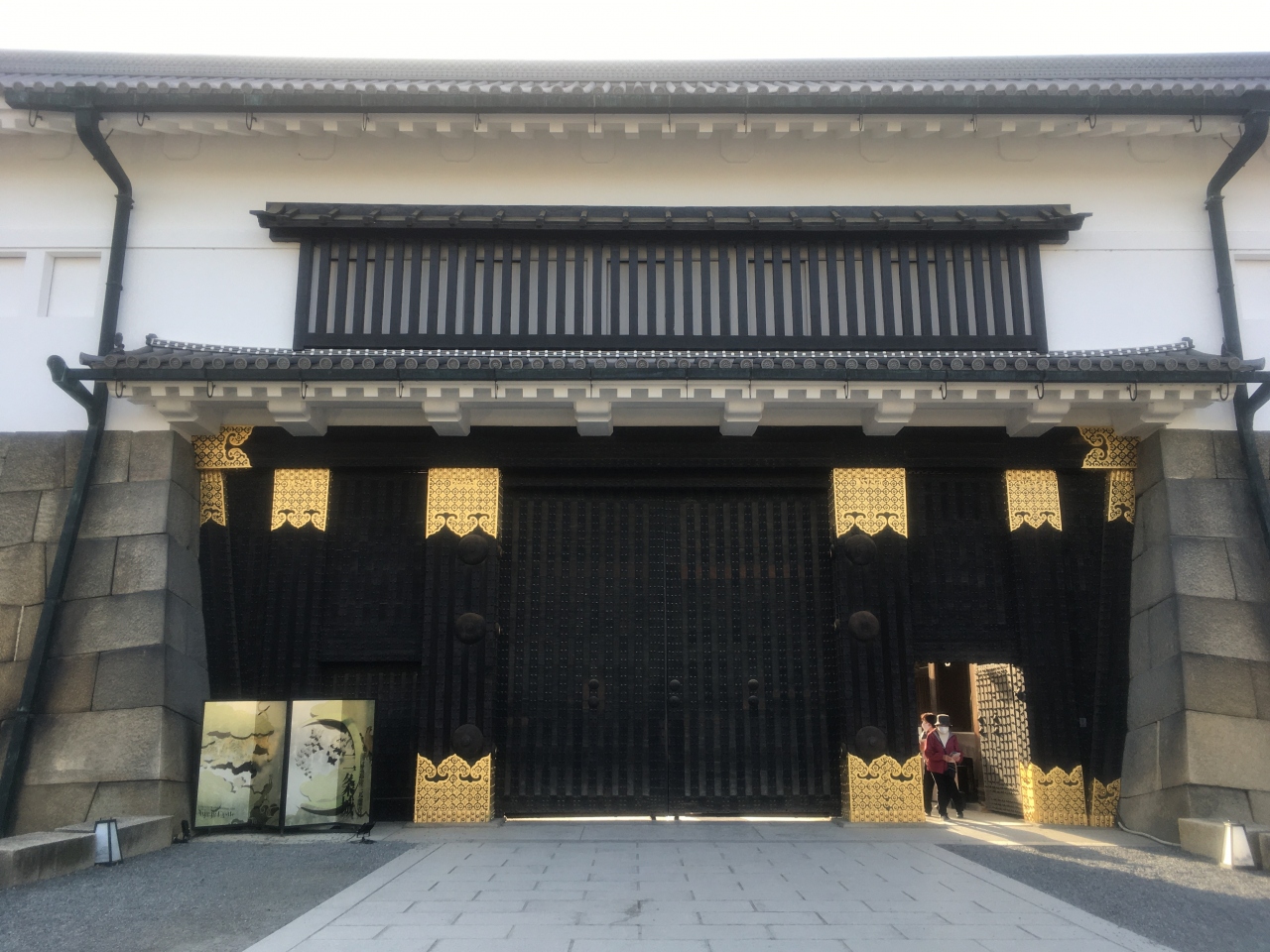 二条城が築城された1603年に造られた正門です。現在の門は1662年に再建されました。2014年から老朽化した屋根瓦の葺き替えや漆喰を塗り替え、金箔貼りなど修復工事が行われ2017年に完成、当時の姿に美しく蘇りました。とても重厚で立派な門で、国の重要文化財に指定されています。