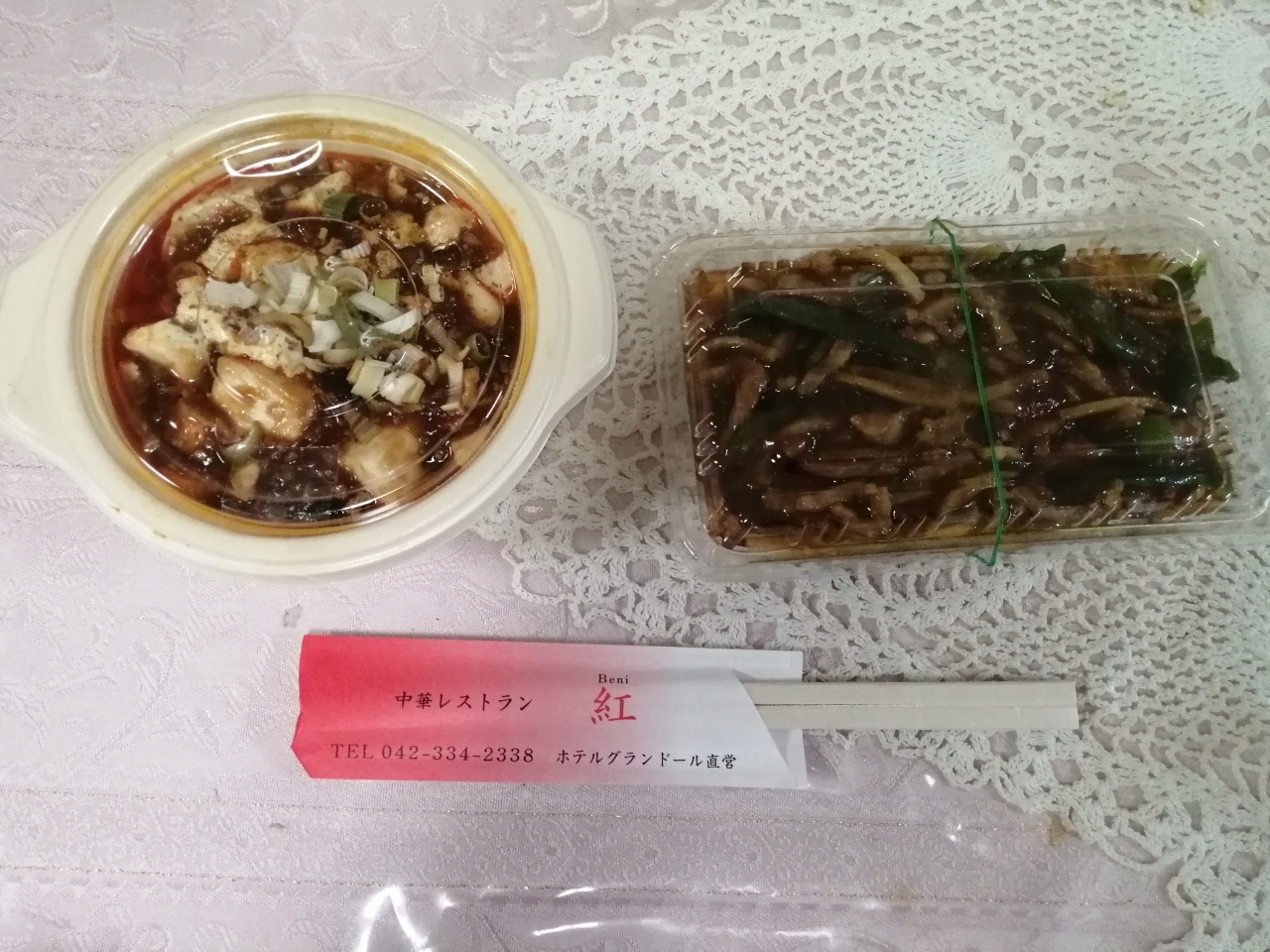 西武多摩川線の多磨駅北側の踏切近くのホテルの一階にある中華レストラン。平日の夕方に、別館の前でテイクアウト料理も販売していたので、購入。1品300~400円程度で5~6種類だが、総菜屋や弁当屋の料理とは一味違って美味しい。