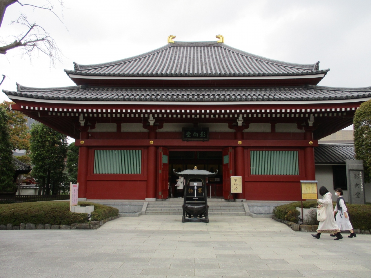 浅草寺の西側にお堂や碑などがたくさん集まる場所があります。影向堂はその中で規模が大きなお堂です。赤色が映えて美しいです。内陣に十二支の生まれ年守り本尊、外陣に浅草名所七福神の大黒天がお祀りされています。