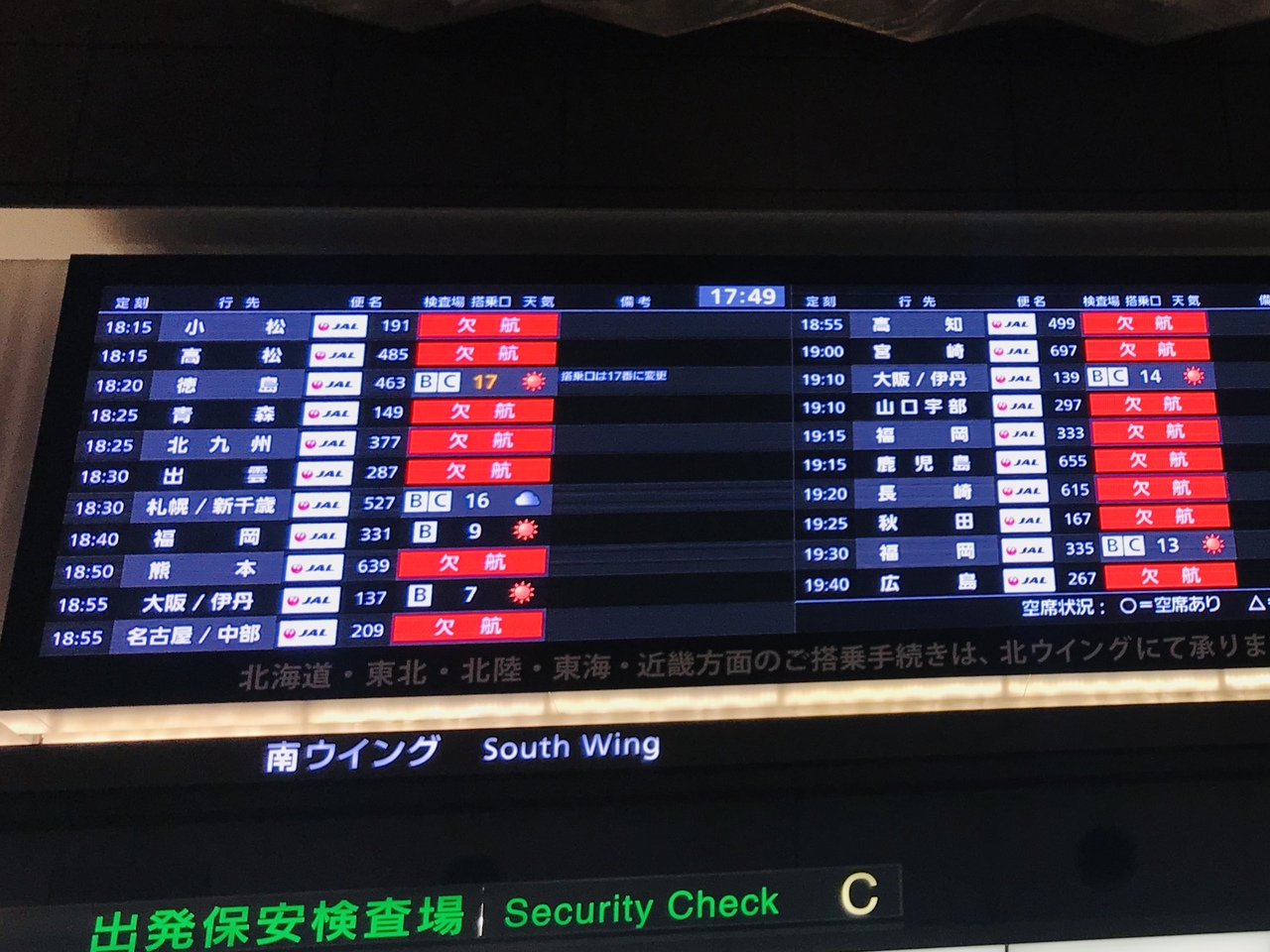 いつも羽田ー伊丹線を利用するので北ウイングなのですが、この日は北ウイングが閉鎖され、全ての便が南ウイングからの出発でした。