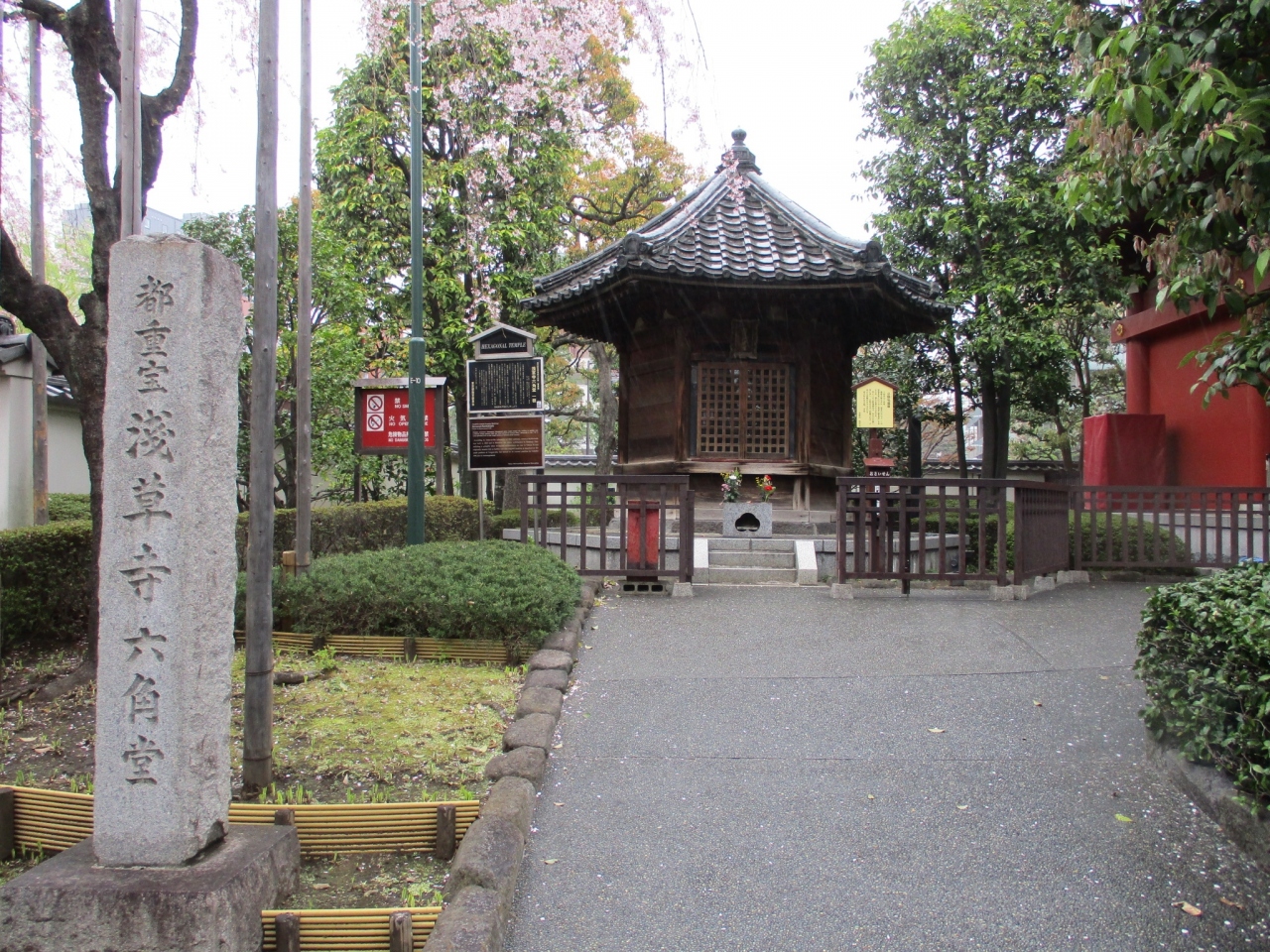 浅草寺の本堂の西側、影向堂の左隣にあります。1618年に建てられた六角形のお堂です。古い木のお堂の上に瓦屋根がのっています。都内最古の木造建築だそうです。度重なる火災や関東大震災、大空襲を免れて残っているのがすごいと思いました。