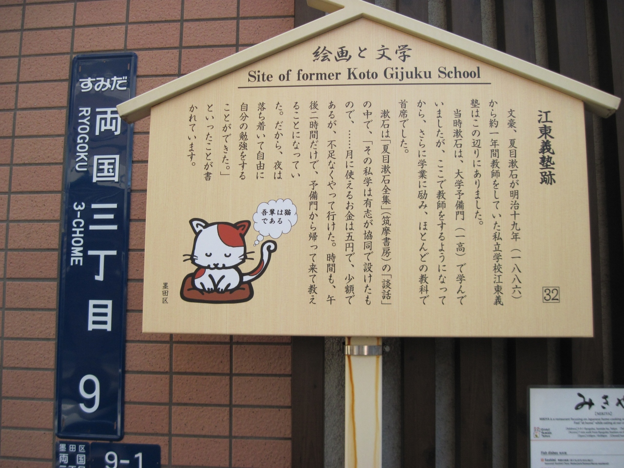 両国の回向院裏手を散策していて、住宅の壁沿いに立て札がありました。昔の私立学校跡で、有名な夏目漱石が若い頃に、この学校で教壇に立って教えていたそうです。今でいう非常勤講師として、アルバイト先の学校だったのかと思いました。