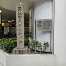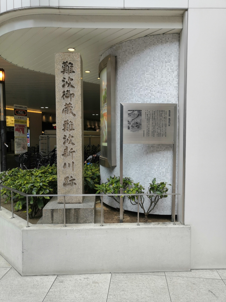 なんばパークスの北側の、なんばシティとの間のエリアにあります。大型の商業施設に挟まれてやや異彩ですね。御蔵は米蔵で新川はそのまま川ということで、米蔵と川があったということです。石碑の右側に説明文があるので、そちらを見れば十分理解できました。