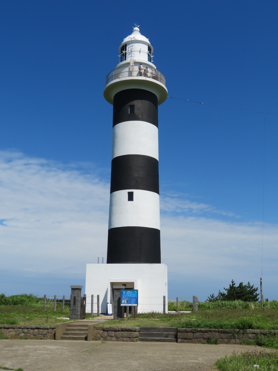 入道崎に建っている灯台で、白と黒の縞模様の外観が特徴的だと思います。