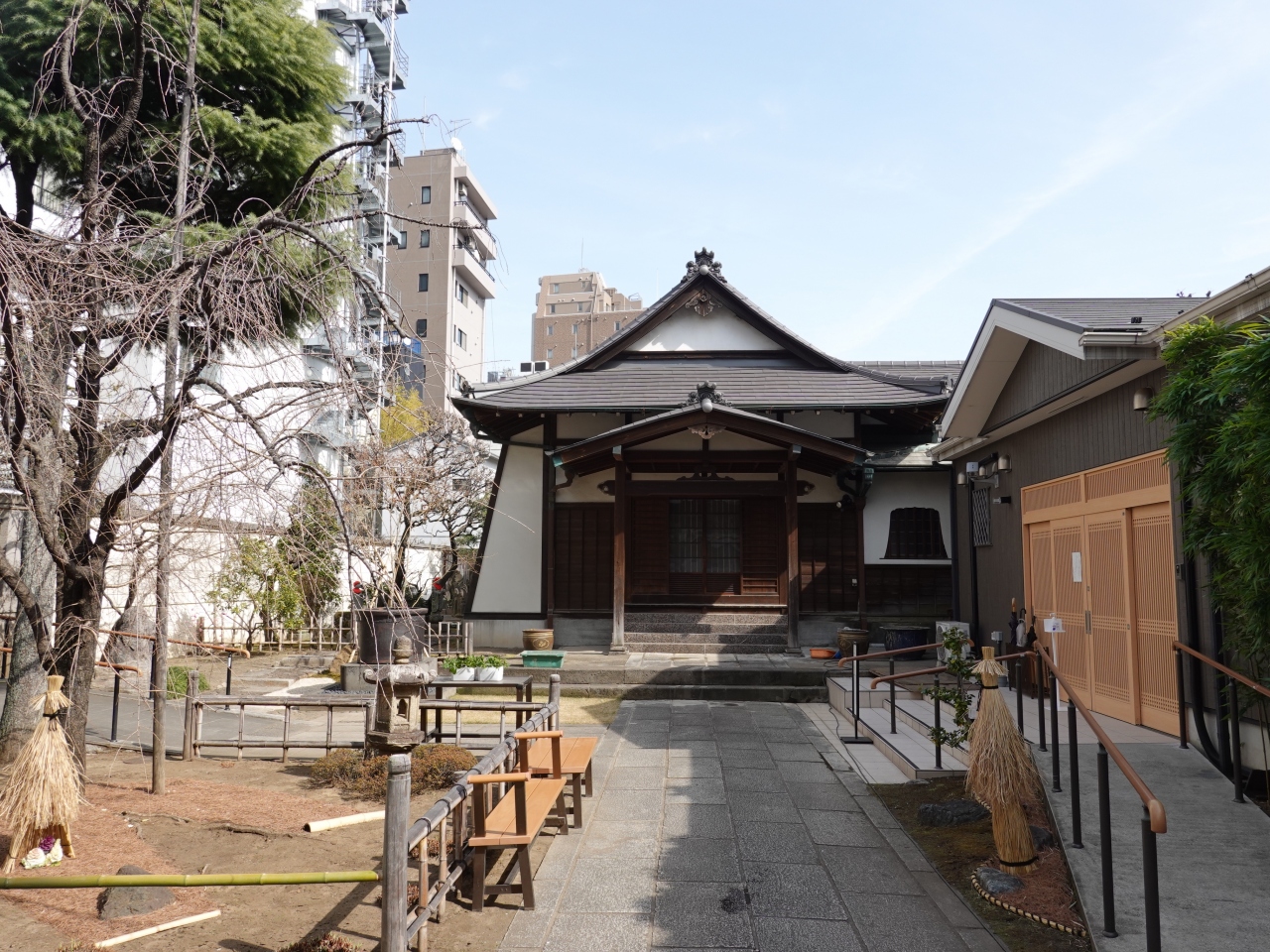 光明寺は元浅草にある小さなお寺のひとつで、浄土宗寺院です。2月末の平日に足を運んだところ、境内で工事が行われていました。おもに植栽のメンテナンスのようですが、参拝にはちょっと残念なタイミングでした。時を改めて訪問し、美しくなった境内を拝見したいものです。