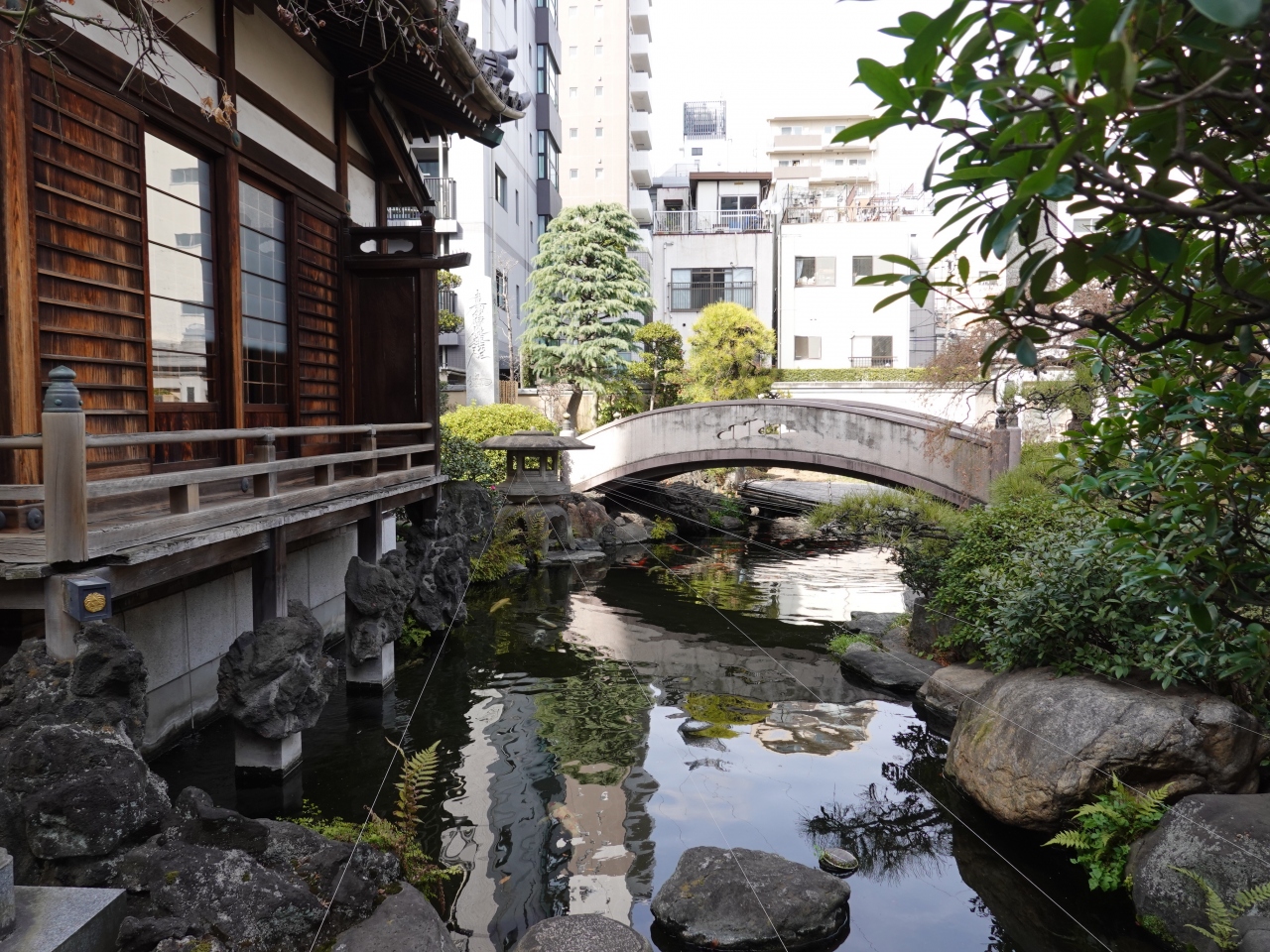 台東区松が谷にある妙音寺は日蓮宗のお寺です。このあたりは、お寺が密集するエリアですが、そんな中でも広い境内と大きな本堂を有するお寺です。境内には日本庭園があり、池があり、橋がかかり、さらに弁天堂があるなど、なかなか見ごたえがありました。2月末でしたが濃い緑が彩りを加えていたのも良いと思いました。