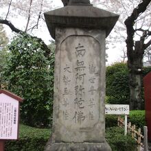 浅草寺の西側の碑や小さなお堂などが集まっている中にあります。大きな石の正面に「南無阿弥陀仏」右に「観世音菩薩」左に「大勢至菩薩」と刻まれています。この碑は文政10年(1827)江戸屏風坂下(現在の上野)の鹿島屋弥兵衛が建てたものです。江戸町人の阿弥陀様を慕う心が現在に繋がっています。