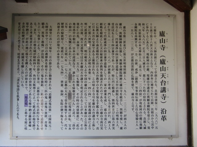 一通り読みましたが、938年に延暦寺の元三大師が草創した天台宗のお寺であること、紫式部の曾祖父がここに邸宅を構え、平安時代の庭園を表現した「源氏庭」を作成し、紫式部がこの地で「源氏物語」を執筆した、とありました。