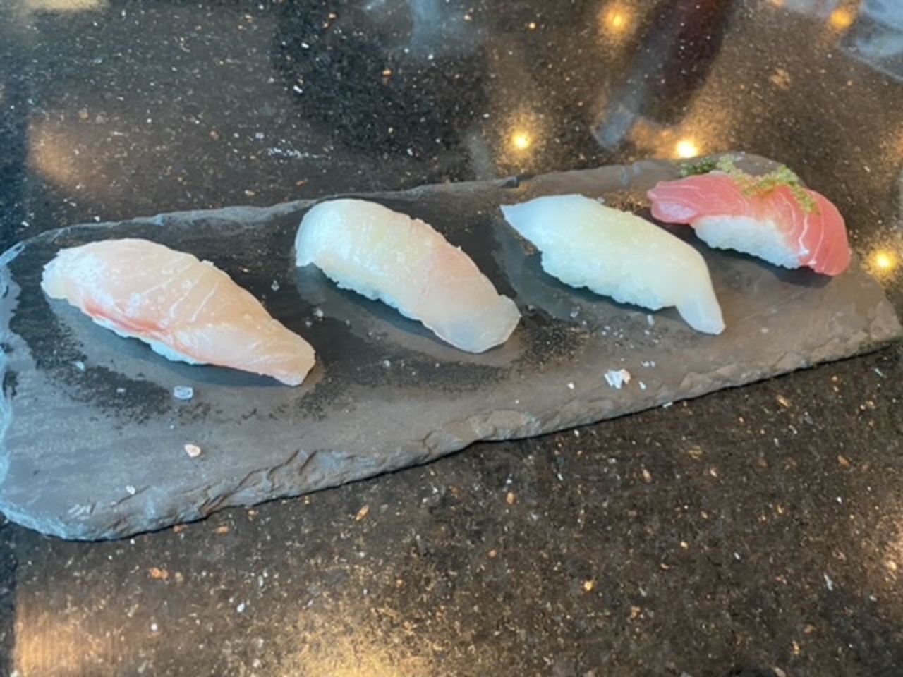 先ずは石垣牛にぎり、そして県産魚食べ比べ!県産生マグロ、シチューマチ、アーラミーバイ、セイイカの4貫。