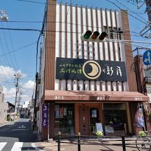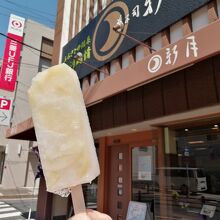 5月上旬、まだ“くずバー”は出していない店もありますが、「新月」の店先に“のぼり”を発見したので入ってみました。くずバーの種類は全6種。各税込165円。その中から「白桃」をチョイス。フルーツ系のくずバーを食べるのは初めてです。