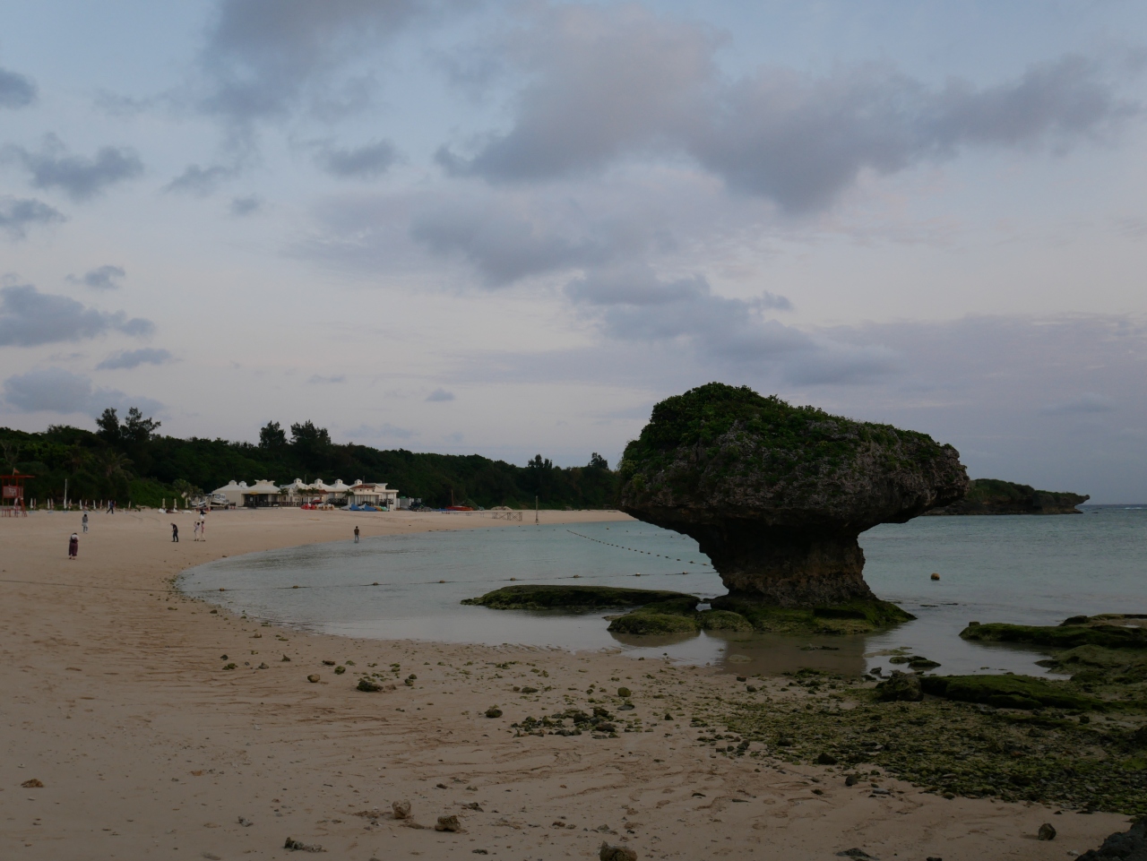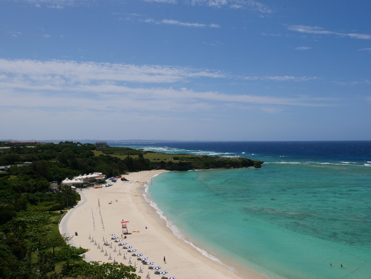 ホテル日航アリビラの目の前にあるビーチ。周辺はクラゲも生息するらしく、きちんと遊泳可能エリアが区切られていました。ビーチは白浜がとても美しいですが、周辺には岩が連なるエリアもあり、ホテル宿泊時の散策には良いと思います。