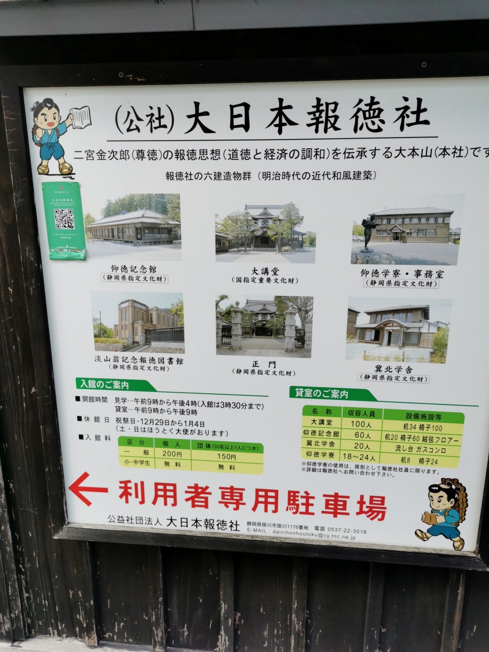 静岡ドライブで掛川市の掛川城公園にある掛川城に行きました。城下に有料の駐車場があります。天守閣までは歩いて10分ほどですが、途中に「大日本報徳社」がありました。二宮尊徳の報徳思想を伝承する総本山との事です。メインの大講堂はかなり大ぶりの立派な建造物でした。入館は有料です。開館時間前でしたので建物だけを拝見しました。