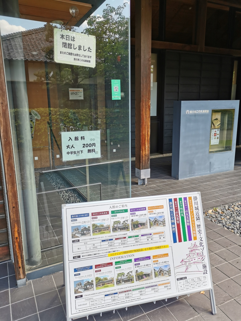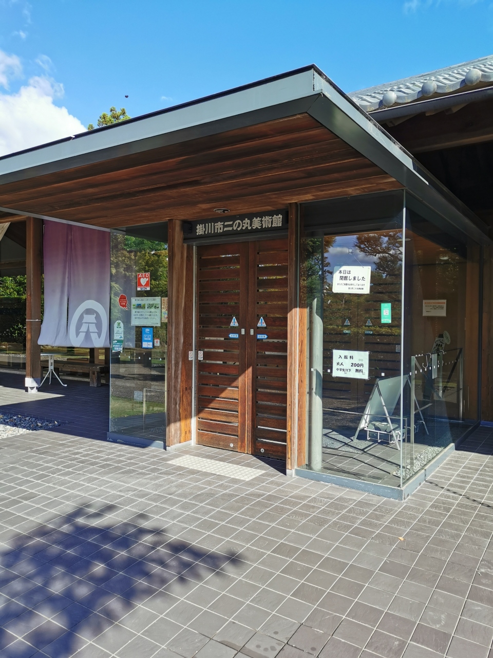 静岡ドライブで掛川市の掛川城公園に行きました。城下に有料の駐車場があります(お代はお安いです)。掛川城の天守閣までは歩いて10分ほどですが、途中に「掛川市二の丸美術館」がありました。こちらの美術館は掛川出身の事業家が建築費、美術工芸品を寄贈して平成10年に開館したとの事。今回は時間があわず入館できませんでしたが、掛川城の見上げられて綺麗な美術館でした。