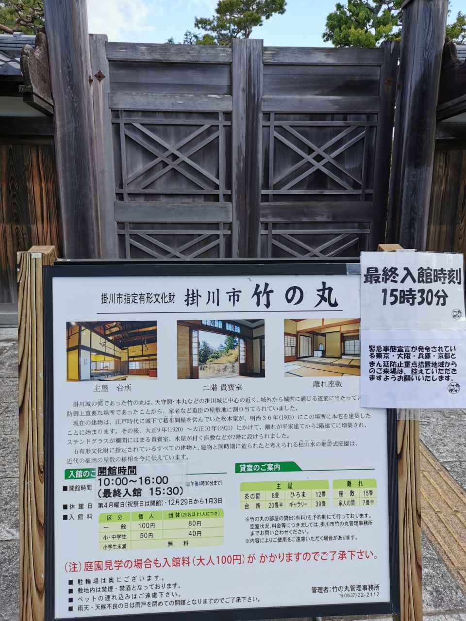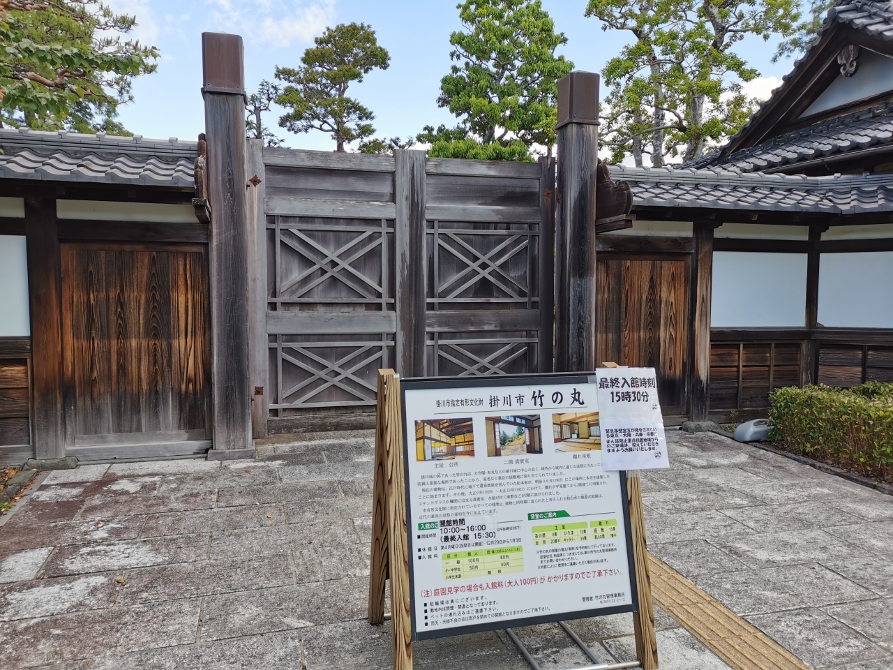 静岡ドライブで掛川市の掛川城公園に行きました。城下に有料の駐車場があります(お代はお安いです)。掛川城の天守閣までは歩いて10分ほどですが、途中に「竹の丸」があります。竹の丸は掛川城の郭で家老などの重臣の屋敷だったそうです。現在の建物は明治36年に建築されたものとの事。入館は有料、文化財なのですがお部屋も貸していただける見たいです。今回は入館できず門止まりでしたが、いつかは拝観したいですね。